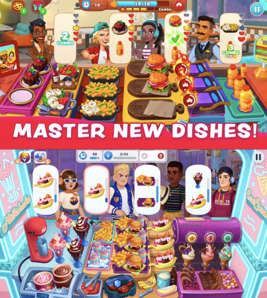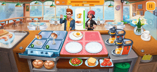 不同订单的操作流程和难度不同 玩家每一个章节玩到后面,会遇到越来越多点高完成难度订单的客人;玩家则需要通过关内操作和关外升级才能更快的处理好他们的订单,提高玩家单关完成的订单数量。这导致在每个章节的最后几关,玩家总会手忙脚乱的在关卡中整个餐厅全速操作。 但当玩家通关前一章,进入到新章节、新餐厅的之后。订单和厨具都会随着餐厅变化而改变,玩家则需要重新学习新的菜品制作方式,操作流程与点击动线。关卡难度也会重新从慢速的客人订单开始做起。 随后伴着各种厨具的解锁升级,玩家对关卡和订单制作流程的逐渐熟悉精通,关卡难度也会逐渐提升,并继续进入到新的手忙脚乱循环之中。 后续各个地图均一次次重复此过程。