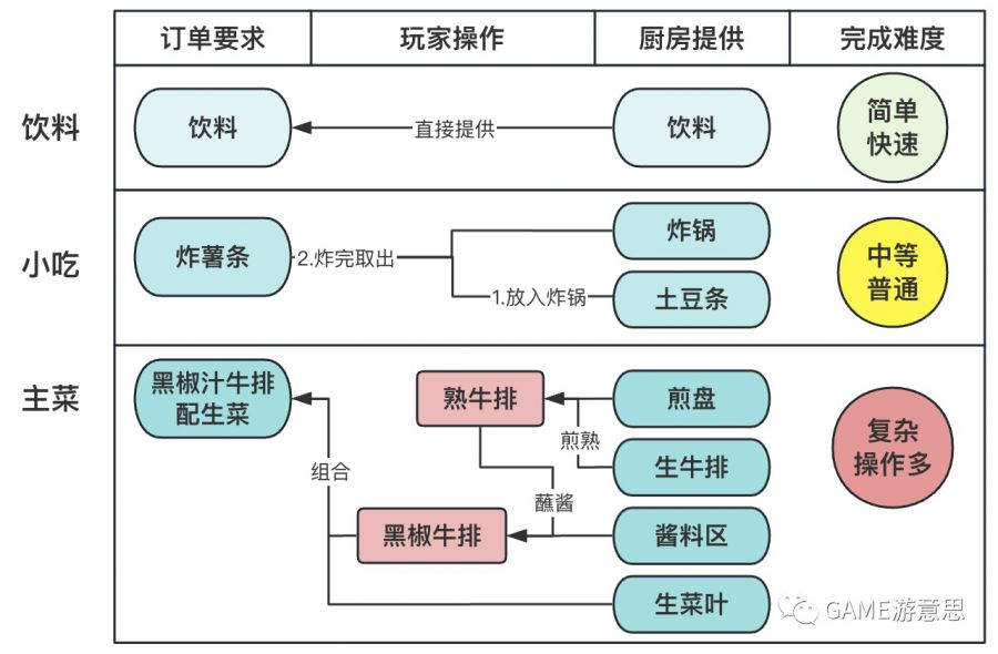将Cooking游戏的核心玩法部分体验拆解 1. 时间压力提高了游戏门槛 由于Cooking是时间管理游戏,所以时间压力是体验中很重要的环节,玩家需要在限时失败的倒计时压力下进行对应的操作和游戏行为。这给玩家带来了一定程度的刺激和紧张感,而适当的紧张感又可以提升玩家通关后的成就感。 但是从另一个角度来说,时间压力也大大限制了玩家的游玩场景和游戏体验,玩家必须处在一个专心、集中、认真、灵敏的状态下才可以很好地进行游戏过程。 高度紧张没有松弛的状态一定程度上会消耗玩家的精力,减少玩家的游戏时长和游戏生命周期(玩一宿《愤怒的小鸟》应该比玩一宿《街霸》轻松很多);于此同时也会筛选掉很多手残党和佛系玩家,很多人特别是休闲用户们天生就不喜欢玩让人“很紧张”的游戏。所以Cooking游戏对玩家的上手门槛是很高的,对玩家群体也有很强的筛选性,这些都极大限制了这一品类的覆盖度和渗透率。 2. 订单匹配机制和餐厅地图通关机制造成游戏体验曲线重复 前面提到,Cooking其实是一种“匹配Match”游戏,在每一章的不同地图中,各种设置几种不同类型的订单来给玩家设置关卡目标,而各种类型订单的数量和配比关系会造成游戏难度的变化。