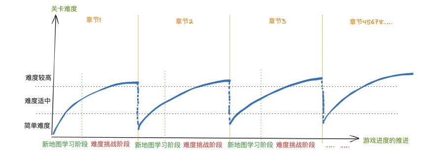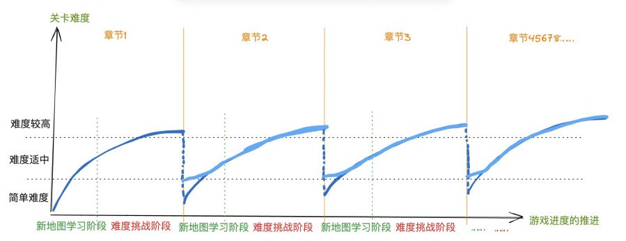 Cooking游戏的难度体验曲线 总而言之,当前Cooking游戏的难度体验曲线是比较简单且枯燥的,每次玩家历经新的章节均会重复循环的经历关卡过于简单、关卡难度适中、关卡特别难玩起来很累的过程。而这也会导致每章玩家在初期和后期,有重复的、不可解决的负面体验。 在每章节初期,顾客订单简单,玩家操作很容易,不需要策略,玩家体验“罚站感”(无所事事)。 在每章节的末期高难度关卡中,玩家操作难度、速度、准确率要求极高。玩家体验“速度与激情” 而在章节之中的每一关,难度都可以归纳为玩家操作数量与顾客订单难度的动态平衡曲线,玩家多玩几章后很容易会发现,其实每张地图基本只换了皮(不同的食物和厨具),操作方式和过关节奏是高度重复的。Cooking游戏是一个上手门槛高、难度曲线单薄粗暴的品类,这两点也是限制Cooking出爆款的两个重要原因。 3. 美术只能卷画面? 由于传统Cooking品类对时间压力和匹配订单的机制进行了限制,这也导致了Cooking品类最终和当前的消除品类一样,进入了卷美术、卷买量的向下螺旋之中。各种CP也把买fake广告的手段带入到Cooking题材之中,这对这个题材新鲜血液的输入和整体环境的健康而言都不是好事。