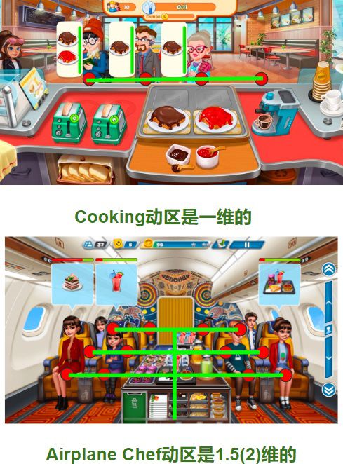 由于设计了多行顾客,每章节前期简单关卡不再像过去那样“无事可做”了 其实也不是雨后为了吹这个项目而盲目吹,在2年前我就曾经深度调研过《Airplane Chefs》(外服上的比较早)的体验,以及分析过【Y轴设计】对于传统Cooking项目实际的提升和变革。 从某种角度来讲,Y轴的设计不仅是在游戏中增加了一个维度的体验那么简单。它的设计加入游戏以后对传统Cooking游戏的短板解决作用也是一种“降维打击”。 而仅需一个设计就能击穿解决前代同品类游戏的多个短板,这也正是我之前极为推崇的“优雅且高级”的游戏设计方式。