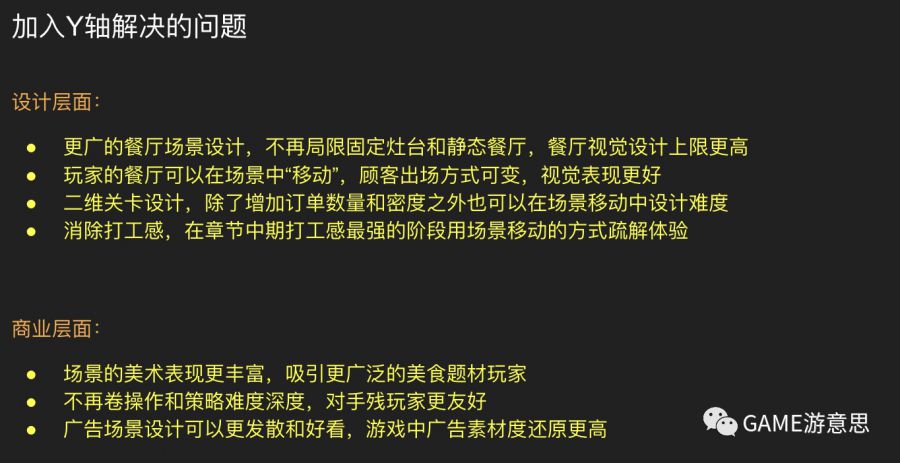 曾经写过的分析ppt列举Y轴如何解决各类Cooking顽疾 总结 《飞机大厨Airplane Chefs》的背后的体验跃升,来自于【Y轴】的加入。它将传统Cooking游戏中的场景表现、关卡体验、美术风格、题材范围等设计,提升到另一种思考维度,并且将它们一并解决。这可能也是它如今在国服一经上线就夺得Cooking品类冠军的原因,因为将传统Cooking游戏的各种短板解决之后新面貌的Cooking表现形式和玩法对玩家来说太丰富而有趣了。 雨后在这里也做个预言,Cooking题材游戏如果未来出现收入爆款,一定不是传统的Cooking模式,大概率会以类似于《飞机大厨Airplane Chefs》的方式,横空出现了某种新的玩法设计规则,并大大缓解甚至解决了时间管理消除游戏中的各种体验缺失和关卡设计缺陷,同时这种形式还能美术表现上以另一种视觉表现带给玩家奇特而新鲜的感受。 |