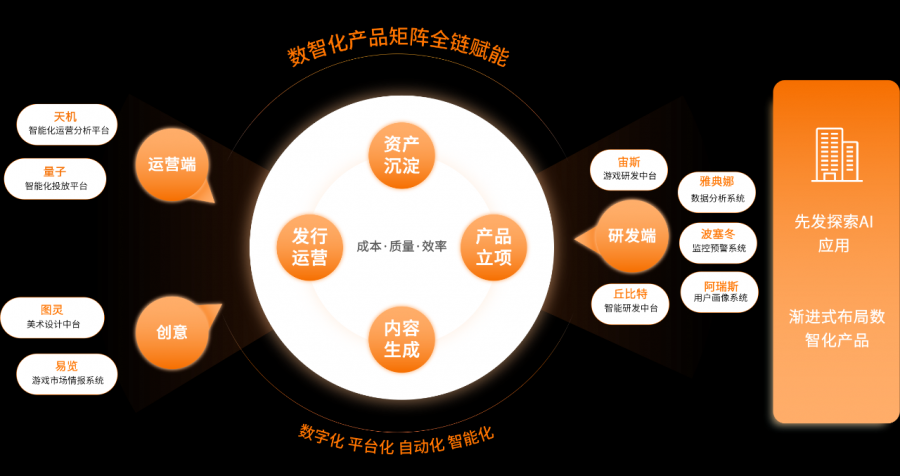 目前三七互娱的产品储备共计超过30款,题材画风涵盖唯美古风、西方魔幻、写实欧洲中世纪、未来科技、东方玄幻等多种类型,其中唯美古风MMORPG《扶摇一梦》、神话题材卡牌游戏《龙与爱丽丝》、Q版3D异世界冒险MMORPG《空之勇者》以及西方魔幻MMORPG《失落之门:序章》等重要自研产品均已获得版号;而《失落星环》《Mecha Domination》等多款游戏已在海外市场进行小规模测试,《Puzzles & Chaos》预计也将在近期上线海外市场。 值得一提的是,以“研运一体”战略为基础,三七互娱一直加大自研领域的投入力度,并在不同的品类进行探索。公司内部,通过多元化的激励方式,对不同品类产品设立激励阶梯制度,鼓励员工创新,走出舒适区。正是在这样的背景下,在储备的产品中,《扶摇一梦》《空之勇者》《龙与爱丽丝》《失落之门:序章》等均是出自三七互娱自研团队。 作为国内最早实现AI深度赋能游戏研运工业化全链的游戏厂商之一,三七互娱依托多年来沉淀的海量数据与技术优势,打造了一整套嵌入AI与大数据技术的数智化产品矩阵,贯穿研运全流程,构建出一条成熟、完整的游戏工业化管线。