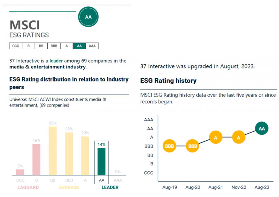 例如,在公司自研的《斗罗大陆:魂师对决》中,曾有效应用了AI数值平衡测试功能,改善了玩家的游戏体验,提升游戏生命周期。又例如公司将AIGC技术融入自研的美术设计中台“图灵”之中,赋能辅助文本、图像、音频、视频等设计资产的生成、储备与管理。 优质的产品来源形成丰富的产品矩阵,再叠加AI、大数据带来在发行及运营上的优势,三七互娱在下半年有望伴随更多优质新品的上线步入新一轮加速发展期。 主动承担社会责任,ESG评级再创新高 作为一家以实现可持续发展为愿景的互联网文娱企业,三七互娱在追求业务持续突破的同时,一直以创造更大的社会共享价值为己任,在持续助力乡村人才振兴、协同推进特色产业帮扶、数字赋能正向价值传播、产研合作培育青年人才、慈善参与共建美好社会等方面积极践行企业社会责任。 近期,国际权威指数机构摩根士丹利资本国际公司明晟(英文简称“MSCI”)公布最新ESG(环境、社会和企业治理)评级结果,三七互娱评级跃升至AA级,成为目前中国互联网行业唯一达到此评级的企业,也是国内唯一一家进入MSCI全球传媒娱乐行业ESG评级AA级的企业。